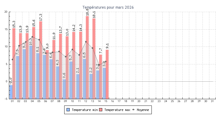 | Total | -1.0 °C | 18.8 °C | 8.9 °C | 6.9 km/h (54.7 km/h) | NO |