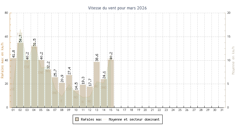 | min | max | moy | Vitesse (rafales) | Secteur | ||